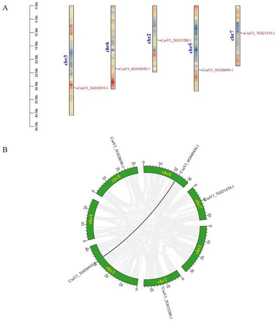 (A) Chromosomal location of CsFBAs. The colored rectangular bars represent the chromosomes of cucumber, and the 0–45 Mb scale represents chromosome length. (B) Synteny analysis of FBA genes on cucumber chromosomes. Seven cucumber chromosomes are colored in green with their names. The black line in the figure denotes the syntenic region of the cucumber genome.