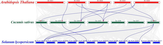 Collinear analyses of FBA genes between cucumber, Arabidopsis, and tomato. The gray lines between cucumber and other plants represent collinear blocks in wide regions of the genomes, while blue lines show the orthologous relationship of FBA genes.