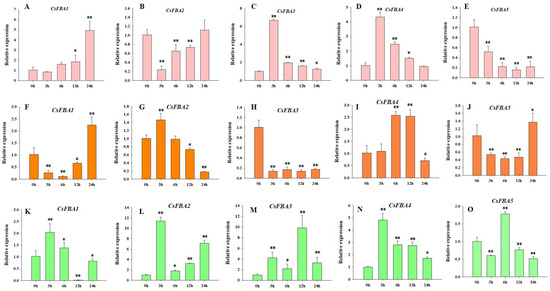 Expression patterns of the five CsFBA genes in cucumber seedlings after low-temperature treatment (A–E), heat treatment (F–J), and salt treatment (K–O). * Significant differences according to t-test (* p < 0.05, ** p < 0.01).