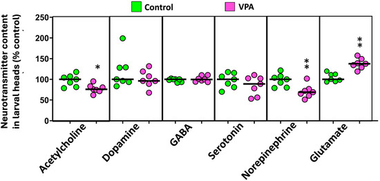 Effects of embryonic exposure to VPA on the neurotransmitter profile of zebrafish larvae. The neurotransmitters analyzed in the larval heads include catecholamines (dopamine, norepinephrine, and epinephrine), serotonin, acetylcholine, GABA, aspartic acid, and glutamate. Data reported as a scatter plot with the median (n = 7) * p < 0.05, ** p < 0.01; Mann–Whitney U test. Data from two independent experiments.