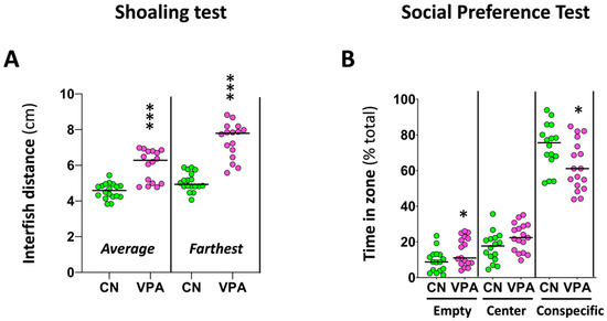 Effect of early-life VPA exposure on social behavior. (A) VPA exposure during the early embryonic development increases the average interfish distance and the farthest interfish distance in the shoaling test. (B) VPA exposure during early embryonic development decreases the time that fish spend in the zone closest to conspecifics, increasing, however, the time spent in the empty zone in the social preference test (SPT). In the SPT, the time spent in each virtual zone for each fish was normalized to the total time of the assay. Data reported as a scatter plot with the median (n = 16–18) * p < 0.05, *** p < 0.001; t-test or Mann–Whitney U test. Data from two independent experiments.