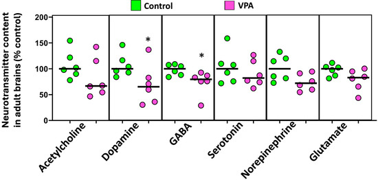 Effects of embryonic exposure to VPA on a neurotransmitter profile in the brain of an adult zebrafish. The neurotransmitters analyzed include catecholamines (dopamine and norepinephrine), serotonin, acetylcholine, GABA, and glutamate. Data reported as a scatter plot with the median (n = 6) * p < 0.05; Mann–Whitney U test. Data from two independent experiments.