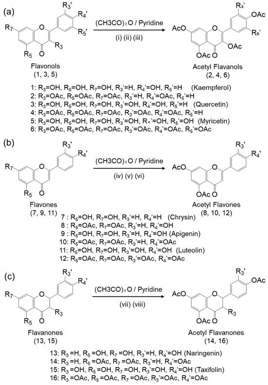 Scheme for the acetylation of flavonols, flavones, and flavanones. (a) The conditions for the acetylation of flavonols were as follows: for compound 2, (i) (CH3CO)2O (5 eq.), 25 °C, 12 h; for compound 4, (ii) (CH3CO)2O (6 eq.), 25 °C, 2 h; and for compound 6, (iii) (CH3CO)2O (7 eq.), 25 °C, 12 h. (b) The conditions for the acetylation of flavones were as follows: for compound 8, (iv) (CH3CO)2O (3 eq.), reflux, 7 h; for compound 10, (v) (CH3CO)2O (4 eq.), reflux, 7 h; and for compound 12, (vi) (CH3CO)2O (5 eq.), reflux, 12 h. (c) The conditions for the acetylation of flavanones were as follows: for compound 14, (vii) (CH3CO)2O (100 eq.), 25 °C, 5 h; for compound 16, (viii) (CH3CO)2O (8 eq.), 37 °C, 1 h.