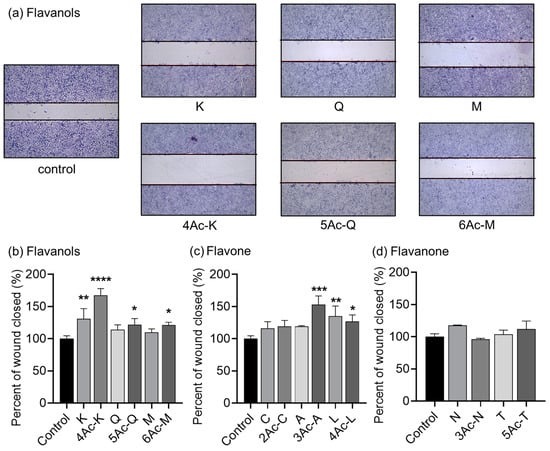 Assessment of anti-cellular migration using wound healing assay. (a) Representative images of scratch assay showing the effect of flavonols (K: kaempferol, Q: quercetin, M: myricetin) and acetyl flavonols treatments (6 h treatment) on wound healing in MDA-MB-231 cells. (b–d), the wound healing quantification of flavonols, flavones (C: chrysin, A: apigenin, L: luteolin), flavanones (N: naringenin, T: taxifolin) and their acetyl derivatives. The results shown (mean ± SD) are representative of two independent experiments (n = 9). * mark denoted significant differences (* p < 0.05, ** p < 0.01, *** p < 0.001, **** p < 0.0001) between the control and each compound using one-way ANOVA followed by Dunnett’s multiple comparison test.