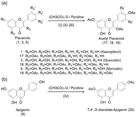 Acetyl-flavonols (compounds 2, 4, and 6), acetyl-flavones (compounds 8, 10, 12, and 20), and acetyl-flavanones (compounds 14 and 16) were synthesized by reacting the parent flavonoids with acetic anhydride in the presence of pyridine as a catalyst (Figure 1). The products were purified by recrystallization. As described below, the chemical structures were determined by 1H-NMR and FT-IR analyses.