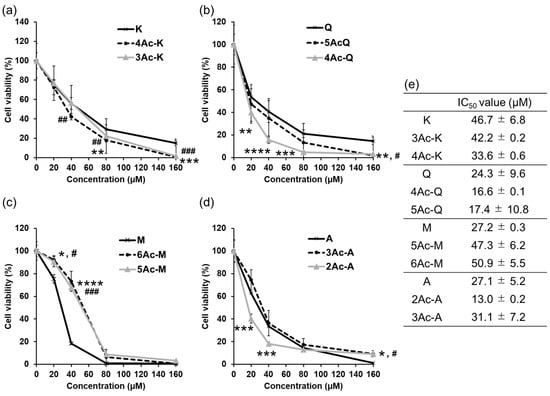 Effect of the existence of the 5-position hydroxyl group of acetylated flavonoids on the proliferation of MDA-MB-231 cells. Cells were treated for 48 h with compounds at concentrations ranging from 0–160 μM or 0.1% DMSO (control). The treated compounds are (a) kaempferol (K), (b) quercetin (Q), (c) myricetin (M), and (d) apigenin (A) as parent compounds and their acetyl derivatives, respectively. (e) IC50 values in μM. IC50 values were calculated from dose- − response curves. The data shown represent the means ± SD of three or more independent experiments. *, # p < 0.05, **, ## p < 0.01, ***, ### p < 0.001, **** p < 0.0001: significant differences between control and each compound (*: 3Ac-K, 4Ac-Q, 5Ac-Q or 2Ac-A, #: 4Ac-K, 5Ac-Q, 6Ac-Q or 3Ac-A) by Tukey’s multiple range test.
