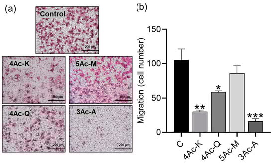 Each acetyl derivative that demonstrated excellent anti-invasive capacity in the wound healing assay was further evaluated in a transwell migration assay, measuring the effect of 24 h treatment with concentrations as low as half the IC50 concentration. This was done to determine whether these compounds could exhibit anti-migratory effects even at lower concentrations and shorter treatment durations (Figure 6). The results indicated that 3Ac-A exhibited the highest anti-migratory capacity, with a migration rate of 15.8% compared to the control. Conversely, 5Ac-M showed the lowest anti-migratory ability, with a migration rate of 86%. Comparing the acetyl derivatives of kaempferol, quercetin, and myricetin, which have flavonol as their basic backbone, 4Ac-K, 4Ac-Q, and 5Ac-M showed the highest anti-migration ability, in that order, respectively. This was consistent with the results of the wound healing assay.