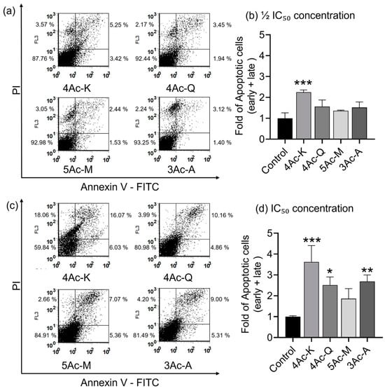 At half the IC50 dose, 4Ac-K exhibited the highest ability to induce apoptosis, at 2.2-fold that of the control (Figure 7b). In contrast, 3Ac-A, 4Ac-Q, and 5Ac-M showed no significant difference compared to the control. Since 3Ac-A and 4Ac-Q, which demonstrated significant effects in the anti-migration assay, did not induce significant apoptosis at half the IC50 dose, cells were also treated with the IC50 concentration for 24 h to determine if higher concentrations would induce apoptosis. At this concentrations, 4Ac-K maintained the strongest apoptosis-inducing ability, followed by 3Ac-A and 4Ac-Q, all of which showed significant apoptosis induction relative to the control (Figure 7d). Although 5Ac-M induced apoptosis, it did not significantly differ from the control.
