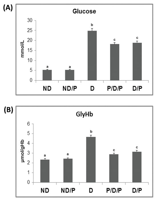 The effect of probiotic Lactobacillus paraplantarum BGCG11 administration on fasting blood glucose concentration (A) and level of glycated haemoglobin (B). ND—non-diabetic control group; ND/P—probiotic Lactobacillus paraplantarum BGCG11-treated non-diabetic group; D—streptozotocin (STZ)-induced diabetic group; P/D/P—one week pre-treatment and four weeks post-treatment with probiotic Lactobacillus paraplantarum BGCG11 of STZ-induced diabetic group; D/P—STZ-induced diabetic rats treated with probiotic Lactobacillus paraplantarum BGCG11 for four weeks. The values are means ± standard error of the mean (S.E.M.) from three separate measurements (technical replica). Groups’ means that do not have the same letter differ significantly from one another (p < 0.05).