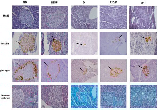 The effect of probiotic Lactobacillus paraplantarum BGCG11 administration on the histological changes, collagen-fibres deposition, and immunohistochemical localization of insulin and glucagon in pancreatic islets. H&E—hematoxylin and eosin staining of pancreatic sections; insulin—light photomicrographs of insulin immunohistochemical staining; glucagon—light photomicrographs of glucagon immunohistochemical staining; Masson trichrome—staining of pancreatic sections within islets (magnification 40×); ND—non-diabetic control group; ND/P—probiotic Lactobacillus paraplantarum BGCG11 treated non-diabetic group; D—STZ-induced diabetic group; P/D/P—one week pre-treatment and four weeks post-treatment with probiotic Lactobacillus paraplantarum BGCG11 of STZ-induced diabetic group; D/P—STZ-induced diabetic rats treated with probiotic Lactobacillus paraplantarum BGCG11 for four weeks. The black arrows indicate the insulin and glucagon accumulations.