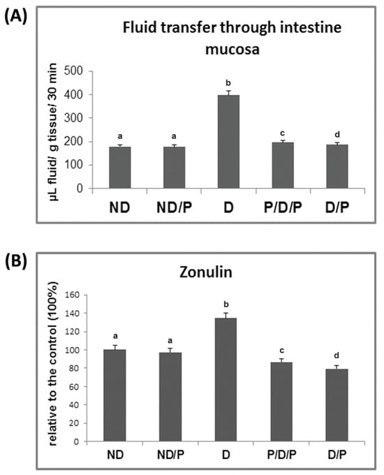 The effect of probiotic L. paraplantarum BGCG11 consumption on the transfer of fluid through intestinal mucosa (A) and serum zonulin levels (B). ND—non-diabetic control group; ND/P—probiotic Lactobacillus paraplantarum BGCG11 treated non-diabetic group; D—STZ-induced diabetic group; P/D/P—one week pre-treatment and four weeks post-treatment with probiotic Lactobacillus paraplantarum BGCG11 of STZ-induced diabetic group; D/P—STZ-induced diabetic rats treated with probiotic Lactobacillus paraplantarum BGCG11 for four weeks. Groups’ means that do not have the same letter differ significantly from one another (p < 0.05).