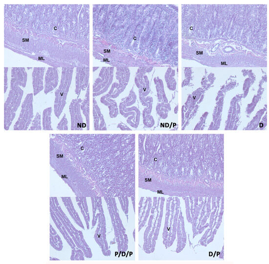 The effect of probiotic Lactobacillus paraplantarum BGCG11 administration on the histological changes of the intestine (duodenum section). H&E staining of duodenum section; V—villi (magnification 20×); SM—submucosa (magnification 40×); ND—non-diabetic control group; ND/P—probiotic Lactobacillus paraplantarum BGCG11 treated non-diabetic group; D—STZ-induced diabetic group; P/D/P—one week pre-treatment and four weeks post-treatment with probiotic Lactobacillus paraplantarum BGCG11 of STZ-induced diabetic group; D/P—STZ-induced diabetic rats treated with probiotic Lactobacillus paraplantarum BGCG11 for four weeks; C—crypts; SM—submucosa; ML—muscular layer; V—villi.