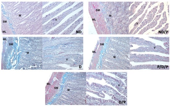 The effect of probiotic Lactobacillus paraplantarum BGCG11 administration on the collagen fibres deposition of the intestine (duodenum section). Masson trichrome staining of duodenum section; V—villi (magnification 20×); SM—submucosa (magnification 40×); ND—non-diabetic control group; ND/P—probiotic Lactobacillus paraplantarum BGCG11 treated non-diabetic group; D—STZ-induced diabetic group; P/D/P—one week pre-treatment and four weeks post-treatment with probiotic Lactobacillus paraplantarum BGCG11 of STZ-induced diabetic group; D/P—STZ-induced diabetic rats treated with probiotic Lactobacillus paraplantarum BGCG11 for four weeks; C—crypts; SM—submucosa; ML—muscular layer; V—villi.