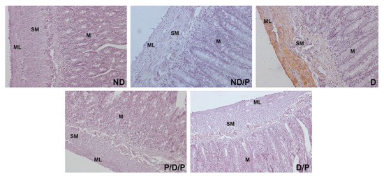 Alpha-smooth muscle actin (alpha-SMA) immunostaining was observed only in the muscular layer and submucosa of the duodenum section of the diabetic group (Figure 6, D), while in other experimental groups, no alpha-SMA-positive staining was detected (Figure 6, ND, ND/P, P/D/P, and D/P).