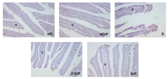 The effect of probiotic Lactobacillus paraplantarum BGCG11 administration on the immunohistochemical localization of fibronectin in the intestine (duodenum section). Light photomicrographs of fibronectin immunohistochemical staining of duodenum section (magnification 20×). ND—non-diabetic control group; ND/P—probiotic Lactobacillus paraplantarum BGCG11 treated non-diabetic group; D—STZ-induced diabetic group; P/D/P—one week pre-treatment and four weeks post-treatment with probiotic Lactobacillus paraplantarum BGCG11 of STZ-induced diabetic group; D/P—STZ-induced diabetic rats treated with probiotic Lactobacillus paraplantarum BGCG11 for four weeks; V—villi.