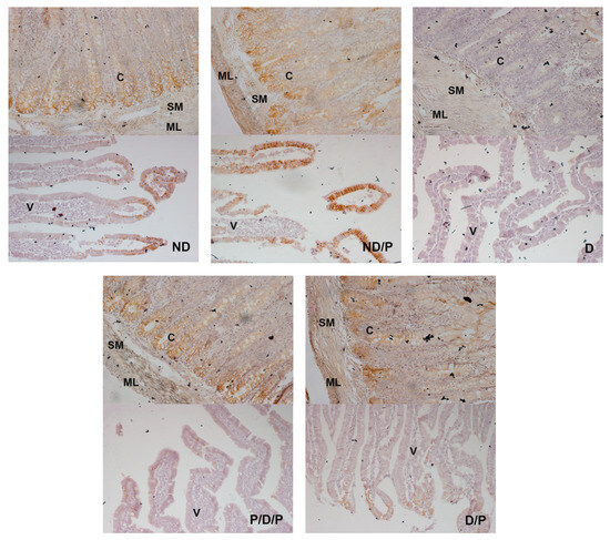E-cadherin (a prominent epithelial marker)-immunostaining was observed in the epithelium of the villi, crypts, the submucosa, and muscular layers in the duodenum sections in the ND and ND/P groups (Figure 8, ND and ND/P). In the diabetic group, no E-cadherin-positive staining was detected (Figure 8, D). In the P/D/P and D/P groups, E-cadherin immunostaining was observed in the same regions as in the control group but with a slightly weaker signal, especially in the villi part (Figure 8, P/D/P and D/P).