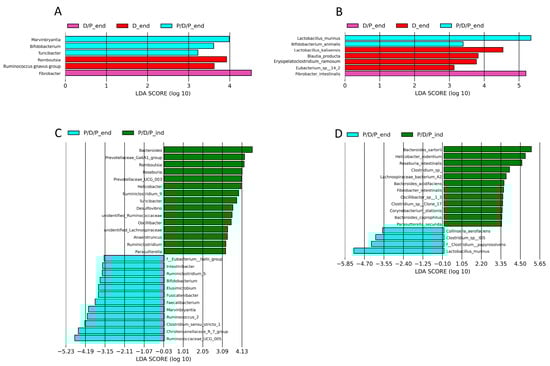 To compare the relative abundances between the groups, we conducted a linear discriminant analysis effect size (LEfSe), as shown in Figure 9. Genera Marvinbryantia, Bifidobacterium, Lactococcus, and Turicibacter, as well as species Bifidobacterium animalis and Lactobacillus murinus, were shown to be microbial markers of the P/D/P group, whereas Fibrobacter intestinalis were enriched in the D/P group, and genera Romboutsia and Ruminococcus gnavus, as well as species Lactobacillus kalixensis, Blautia producta, Erysipelatoclostridium ramosum, and Eubacterium sp. were enriched in the D group (Figure 9A,B).