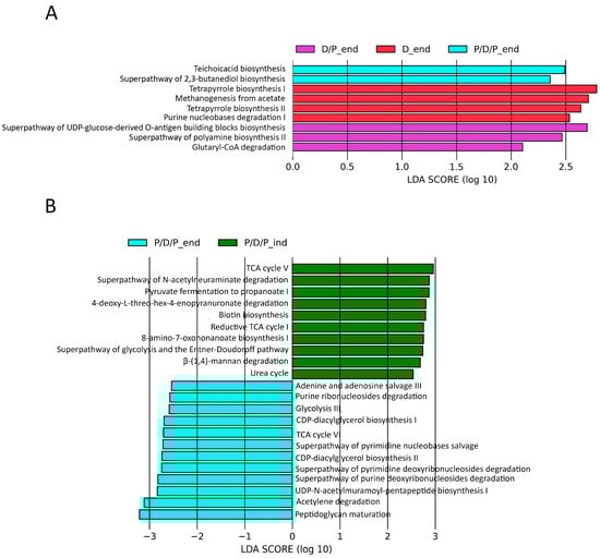 Furthermore, we used the PICRUSt2 pipeline with default options to compare projected microbial metabolic functions between the groups in order to evaluate probable microbial functional composition, presenting only pathways that reached an LDA significance threshold of >2.5. At the end of the treatment, these analyses revealed several pathways involved in teichoic acid biosynthesis (TEICHOICACID-PWY) and butanediol biosynthesis (PWY-6396) as potential markers of the P/D/P group. The D/P group was characterized by pathways involved in lipopolysaccharide (PWY-7328) and polyamines (POLYAMINSYN3-PWY) biosynthesis and carboxylate degradation (PWY-5177). According to the findings, the D group was distinguished by an enrichment of the pathways involved in methanogenesis from acetate (METH-ACETATE-PWY), tetrapyrrole biosynthesis (PWY-5188, PWY-5189), and purine nucleotide degradation (P164-PWY) (Figure 10A).