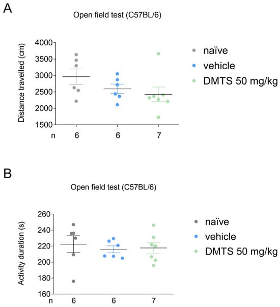 In C57BL/6J mice, DMTS at a dose of 50 mg/kg and vehicle were tested compared to the untreated group. Neither DMTS (50 mg/kg) nor vehicle reduced the time spent moving and the distance traveled during the observed time period (Figure 2). Based on these results, DMTS at 50 mg/kg and the corresponding vehicle were used for the FST and the TST.