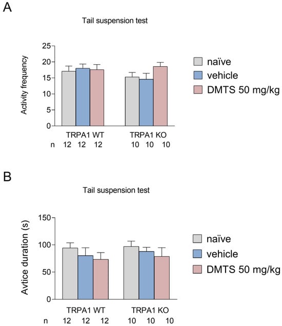 Activity frequency (A) and time spent immobile (B) in different treatment groups of Trpa1 WT and KO mice in the tail suspension test. There was a significant effect of treatment neither on activity frequency nor on active duration in either group. Shapiro–Wilk test and Bartlett’s Chi-squared test followed by two-way ANOVA and Fisher post hoc test. n = 10–12. DMTS: dimethyl trisulfide.
