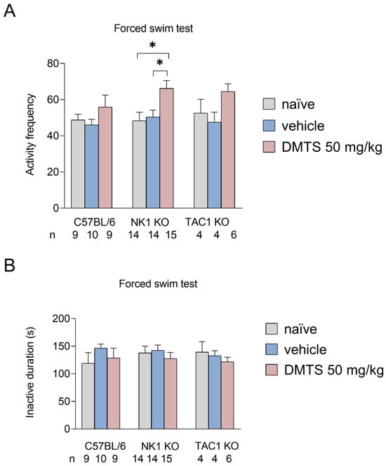 We examined the time spent immobile in seconds and activity frequency in the FST. No significant differences were observed between treatment groups in the time spent inactive for either NK1 wild-type or transgenic animals. In terms of the frequency of active periods in the NK1 KO animals, DMTS increased the number of active periods of the animals compared to both the untreated and vehicle-treated groups (p < 0.05). A similar trend was observed in the C57BL/6J and Tac1 KO animals, but the difference was not statistically significant (Figure 5).