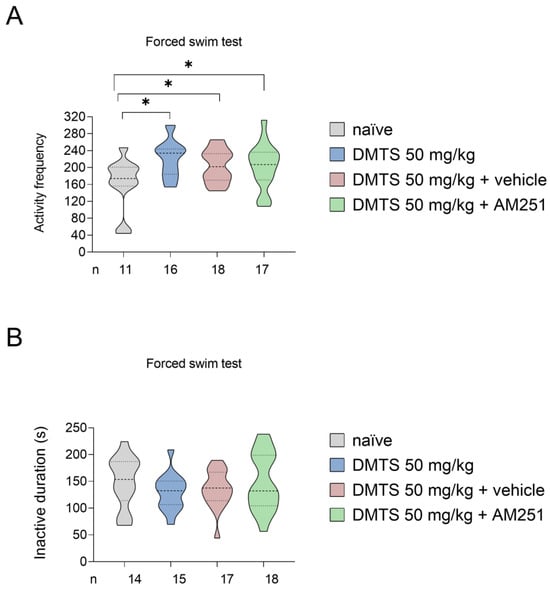 We also assessed the time spent immobile and the frequency of active periods in FST in the C57BL/6J mice. The DMTS treatment significantly increased the activity frequency of mice compared to the untreated group (p < 0.05). DMTS + AM251 co-administration significantly increased the activity frequency compared to the untreated group (p < 0.05), but not in relation to the DMTS-treated group. Furthermore, there was no difference between the effects of DMTS treatment, DMTS + AM251 co-treatment, and DMTS + vehicle co-treatment. The duration of inactivity was not affected by the DMTS treatment or DMTS + AM251 treatment (Figure 6).