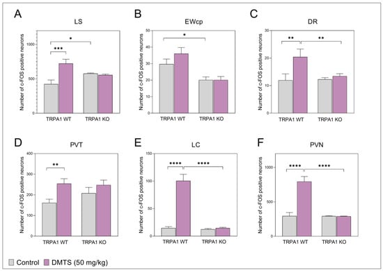 Briefly, these results suggest that it is not exclusively the TRPA1 ion channel that mediates the effect of DMTS on stress adaptation. This is confirmed by the elevated activation in the LC, LS, and PVT brain areas after the treatment, given that there is no TRPA1 ion channel in these brain areas []. Another explanation is the above-mentioned secondary activations from an area of the brain in which the TRPA1 ion channel is expressed. In addition, it was confirmed for almost all the brain areas that, in contrast to the WT mice, the DMTS treatment did not induce neuronal activity enhancement in the KO mice, suggesting a role for the TRPA1 ion channel in mediating the effects of DMTS in acute stress.