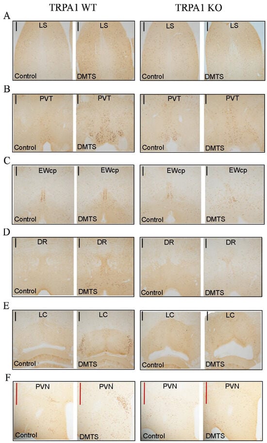 Representative images used for the calculation of the density of c-Fos activation in the brain areas of the Trpa1 WT and KO animals. Immunohistochemistry was visualized with 3,3′-diaminobenzidine. The images were taken with a 10× objective. Apart from the centrally projecting Edinger–Westphal nucleus (EWcp), significantly stronger c-Fos activity was found in all the brain areas examined after the dimethyl trisulfide (DMTS) treatment. LS (lateral septum, (A)), PVT (paraventricular nucleus of the thalamus, (B); EWcp (C)), DR (dorsal raphe nucleus, (D)), LC (locus coeruleus, (E)), PVN (paraventricular nucleus of the hypothalamus, (F)). Control = vehicle-treated. Black line: scale bar 200 μm; red line: scale bar 500 μm.