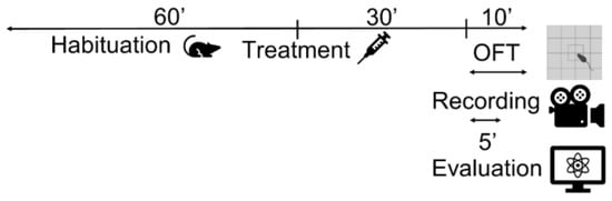 The OFT was used to determine the appropriate dose of DMTS that does not reduce the locomotor activity and spontaneous movement of the animals. Although the OFT is a test used to assess locomotor activity, anxiety, and exploratory behavior in rodents, we used this method only to determine whether different doses of DMTS and their respective vehicles caused the animal to move less, the same, or more in the box []. The evaluation started 30 s after the appearance of the animal (this is how long we allowed them to explore the new environment) and lasted for 5 min (Figure 10). The time spent moving and the total distance covered during the observed interval were recorded using the Noldus EthoVision XT Version 15 software (Noldus Information Technology, Wageningen, The Netherlands). Doses of 50 mg/kg and 60 mg/kg of DMTS and its associated vehicle were tested. Two strains of mice were treated: male Trpa1 WT and C57BL/6J animals.