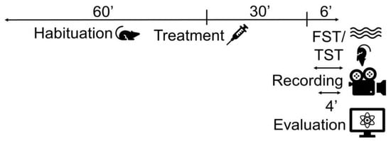After establishing the appropriate dose of DMTS, the experimental animals were studied in acute stress tests—FST and TST. These tests represent acute stress situations in which we can quantify depression-like behavior in animals. FST was performed with the male Trpa1 WT and KO, C56BL/6J, NK1 KO, and Tac1 KO strains. TST was carried out on the Trpa1 WT and KO strains. The animals were first exposed to the arrangement during the experiment. The treatment was performed with a single dose of DMTS or the appropriate vehicle 30 min before the behavioral tests (Figure 11).