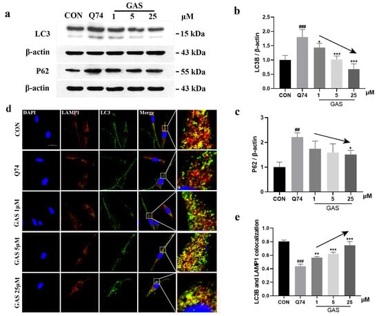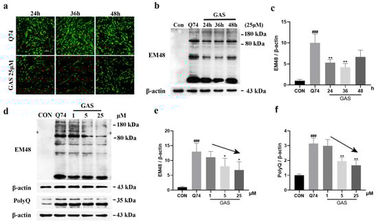 2.2. Gastrodin Promotes mHtt Degradation in Q74 PC12 Cells