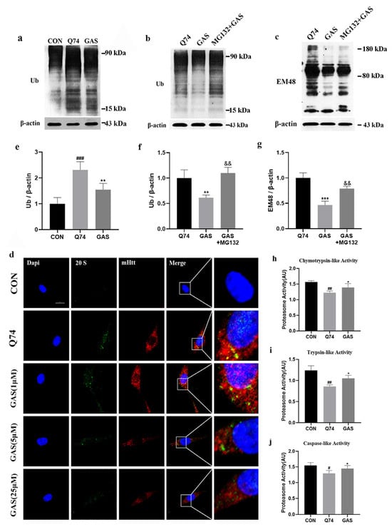 Sun, H.; Li, M.; Li, Y.; Zheng, N.; Li, J.; Li, X.; Liu, Y.; Ji, Q.; Zhou, L.; Su, J.; et al. Gastrodin Improves the Activity of the Ubiquitin–Proteasome System and the Autophagy–Lysosome Pathway to Degrade Mutant Huntingtin. Int. J. Mol. Sci. 2024, 25, 7709. https://doi.org/10.3390/ijms25147709