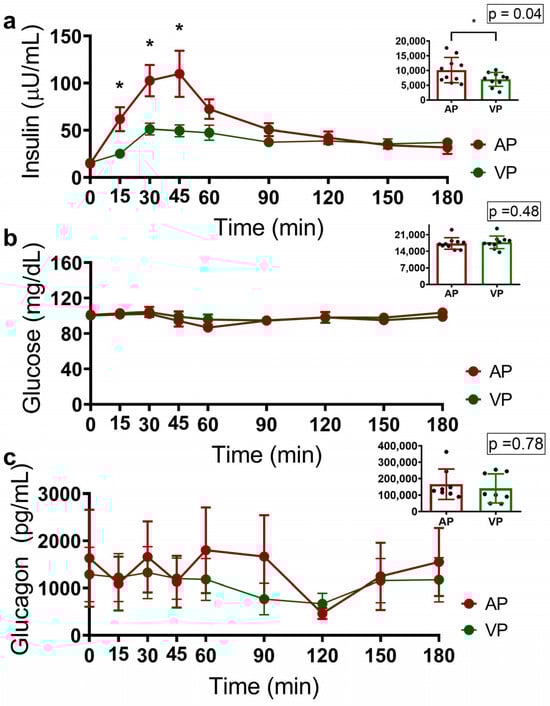 Glucose, insulin, and glucagon curves were generated to evaluate the metabolic effects of the different types of protein. The group that consumed AP had higher insulin concentrations at 15, 30, and 45 min (p = 0.013, p = 0.010 and p = 0.028, respectively), as did the group that consumed VP (p = 0.04), as well as a greater area under the curve (AUC) (Figure 1a). No differences were observed in glucose or glucagon concentrations or in the AUCs (Figure 1b,c).