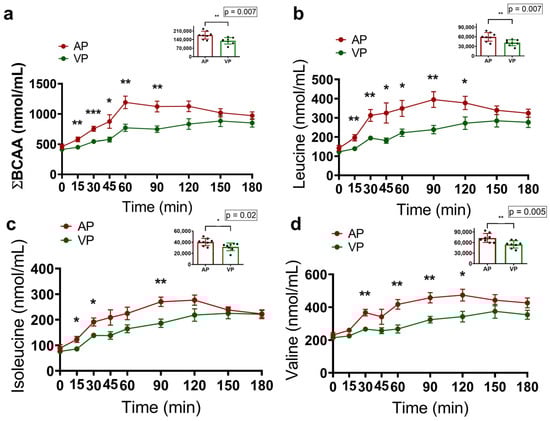 The effect on protein metabolism was evaluated by measuring the concentrations of circulating amino acids. The AP group had higher AUCs for valine (p = 0.005), isoleucine (p = 0.02) and leucine (p = 0.007) (Figure 2b–d). Additionally, lysine (p = 0.05), proline (p = 0.005) and tyrosine (p = 0.007) levels were higher than those in the VP group (Figure S1). Although no differences were detected in the AUCs of glycine, phenylalanine, alanine, arginine, asparagine, aspartate, glutamate, glutamine, serine, histidine, methionine, threonine, or tryptophan, differences in the specific times of the curves were detected for these amino acids (Figures S1 and S2).
