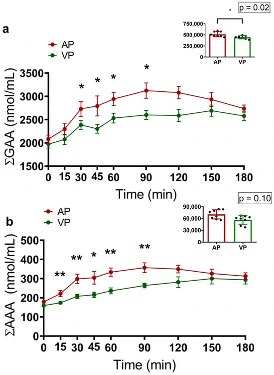 The concentrations of aromatic amino acids (∑AAAs) in the AP group increased at 15 (p = 0.003), 30 (p = 0.005), 45 (p = 0.05), 60 (p = 0.005), and 90 (p = 0.007) minutes. However, no significant difference in the AUC was observed (p = 0.10) (Figure 3b).