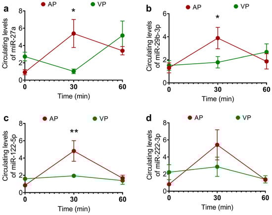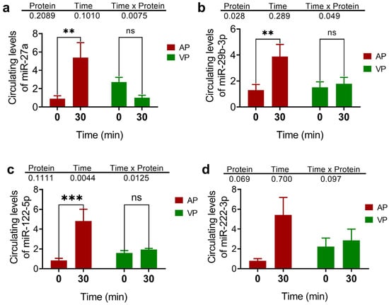 Circulating levels of miR-27a (a), miR-29b-3p (b), miR-122-5p (c), and miR-222-3p (d). The data are presented as the means ± SEs. Two-way ANOVA and post hoc Fisher’s LSD test were used to evaluate the differences in the relative expression of miRNAs between treatments (VP vs. AP) and time points (0 and 30 min). where ** p < 0.01, and *** p < 0.001. The abbreviation “ns” is not significant.