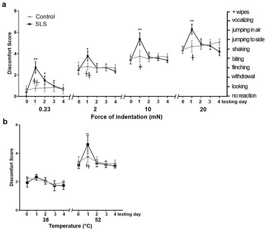 Effects of SLS-induced ICD on DS derived in response to vFFs and a heated contact thermode placed to the cheek. Stimuli were applied before (day 0) and 1 h (day 1), 24 h (day 2), 48 h (day 3), and 72 h (day 4) after SLS or vehicle application. The mean DSs are shown in black for SLS and grey for the control group, respectively. (a) Mean DSs ± SDs for an innocuous vFF of 0.23 mN and mean DSs for a noxious vFF with a 100 µm tip diameter applied with three different bending forces (2, 10, and 20 mN). (b) Mean DSs ± SDs for innocuous (38 °C) and noxious t (52 °C) temperature stimuli. Significant differences before vs. after application for 24 h within groups are marked as follows: * p < 0.05, ** p < 0.01. Significant differences between the groups are marked as follows: † p < 0.05, †† p < 0.01. Data: means ± SDs. N = 12 mice/group.