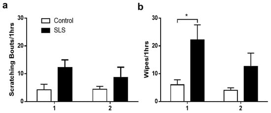Effects of SLS-induced ICD on spontaneous scratching and wiping behaviors. Spontaneous scratching bouts (a) and wipes (b) were counted 1 h (day 1) and 24 h (day 2) after removal of the distilled water (control group) or 5% SLS (SLS group). * p < 0.05 indicates significance between groups. Data: means ± SEMs. N = 12 mice/group.