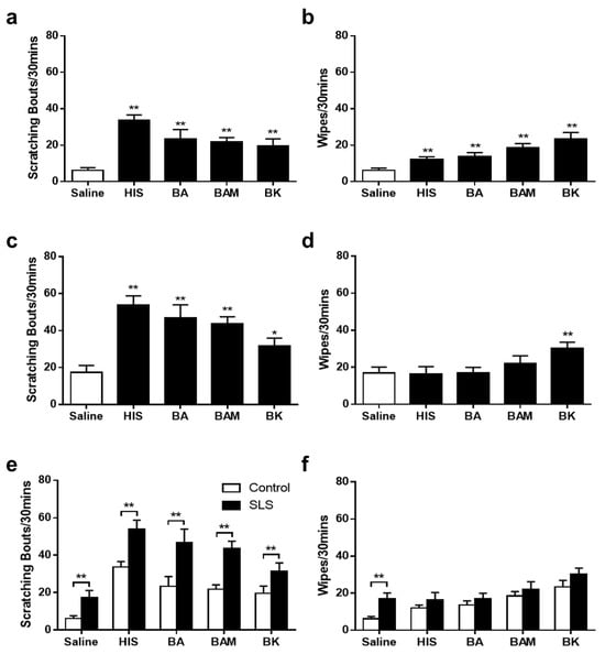 When responses to an injection of saline were compared, the control mice exhibited significantly more bouts of scratching and wipes in response to both the algogen bradykinin and the pruritogens histamine, BA, and BAM8-22 (Figure 3a,b). After SLS application, significantly more scratching was evoked by each pruritogen and the algogen in comparison with saline (Figure 3c). Only BK led to significantly higher wiping numbers in comparison to saline injection (Figure 3d). SLS-treated mice exhibited more scratching but not wiping in comparison to the control mice (Figure 3e,f). However, they also showed significantly more scratching in response to saline. This increased response to saline may have contributed to the greater response to each pruritogen and bradykinin.