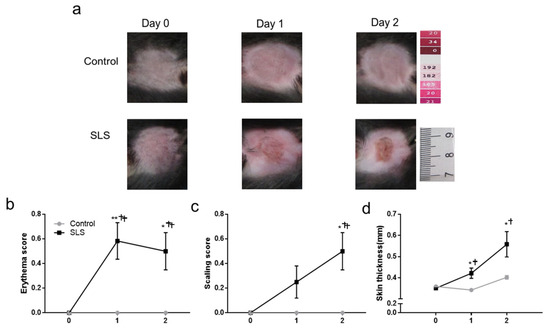The erythema and scaling were scored, and skin-fold thickness was measured. The control mice had no erythema, scaling, nor increased thickness of the skin after treatment with distilled water. The erythema score and skin thickness showed an increase on day 1 and day 2 in the SLS group, whereas the scaling score increased significantly only on day 2 (Figure 4b–d). In comparison with the control group, SLS mice had significantly higher values of erythema and skin thickness on both day 1 and day 2, but a significantly higher scaling score only on day 2 (Figure 4b–d).