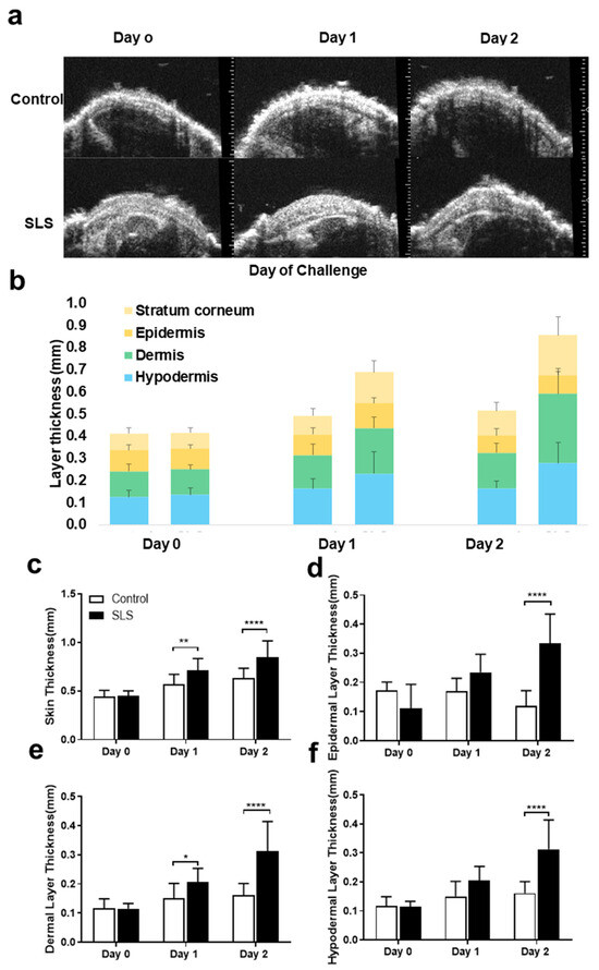 Ultrasound images of each mouse’s cheek were acquired on each day (day 0, day 1, and day 2) for each group and condition. Exemplary ultrasound images for the control group showed similar features, such as skin thickness and smoothness, across all days. There was no difference displayed in overall skin thickness or each skin-layer thickness between each day in the control group and day 0 in the different groups. The SLS group showed an increased overall skin thickness on day 1—more so on day 2 (Figure 5c). This was also indicated by an increase in the thickness of each layer on day 2 (Figure 5d–f). The highest increase was seen in the epidermis and dermis, especially on the second day. The increase in dermal thickness even reached significance on the first day.