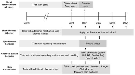 To induce the SLS ICD model, first, the mice were acclimated to the housing facility for 7 days, followed by 5 days of habituation to handling, the testing environment, and the wearing of an Elizabethan collar around the abdomen. The cheek skin was shaved (1 × 1 cm area) under brief anesthesia with isoflurane (2% in pure oxygen). Two days later, filter paper soaked in 5% SLS (Sigma, St. Louis, MO, USA) in distilled water or the vehicle (distilled water) alone was topically applied to the shaved cheek skin by means of a Finn chamber under brief anesthesia with 2% isoflurane and a flow rate of 300 mL/min of oxygen [22]. Cyanoacrylate was applied as a thin layer on the rim of the chamber to affix the cup to the skin. The Finn chamber (Yale Medical School Machine shop, New Haven, CT, USA) consisted of a polyether ether ketone (PEEK) cup (Trident Plastics, Warminster, PA, USA). The cup was a 8 mm diameter disk with a 1.5 mm wide rim around the edge of the disk and was 0.2–0.3 mm deep and could accommodate the thickness of a 5 mm diameter soaked filter paper. PEEK is a biocompatible plastic used in medical applications in orthopedic surgery and in dental implants, among other uses [40].