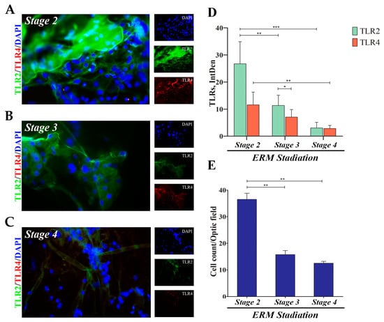 TLR2 and TLR4 protein expression in ERMs as a function of disease severity. A total of six membranes (N = 2 for stage 2, 1F/1M; N = 2 for stage 3, 1F/1M; N = 2 for stage 4, 1F/1M) were collected during pars plana vitrectomy and processed for Epifluorescent analysis (A–C), coupled to Integrated Density (IntDen; (D)) evaluation. Representative merged (main) and single (right side) panels of TLR2 (green) and TLR4 (red) in ERMs at stage 2 (A), stage 3 (B) and stage 4 (C). Membranes were counterstained with nuclear DAPI (blue) to better visualize the cells. Note the significant decrease in immunoreactivity (D) and cellularity (E), depending on severity (p ≤ 0.05). Data represent mean ± SEM and values of fluorescent intensity (IntDen; ImageJ) are expressed in arbitrary units. Magnifications ×400 (bar size = 50 µm). Significances are shown in the panels (* p ≤ 0.05; ** p ≤ 0.01; *** p ≤ 0.005), as calculated using one-way ANOVA followed by a Tukey–Kramer post hoc test (mean ± SEM).