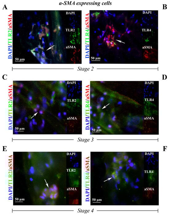 TLR2 and TLR4 immunoreactivity in myoFBs cells populating the ERM at stage 2 ((A,B) N = 2, 1F/1M), at stage 3 ((C,D) N = 2, 2F) and at stage 4 ((E,F) N = 2, 2F). Representative fluorescent panels of TLR2/green (A,C,E) or TLR4/green (B,D,F) and α-SMA/red from double-immunostained and nuclear counterstained (DAPI/blue) ERMs. Note the TLR2 and TLR4 immunoreactivity in, respectively, α-SMA positive myoFBs. Citofixed and whole-mounted membranes were used. Merged and single-channel panels are shown. Magnifications ×400 (bar size = 50 µm). Arrows indicate coexpression of targets.