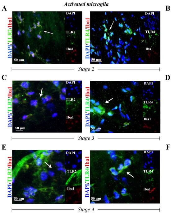 Immunoreactivity for TLR2 and TLR4 was observed in the Iba1-positive cells (respectively, Figure 3A,C,E and Figure 3B,D,F) in ERMs at stage 2 (Figure 3A,B), at stage 3 (Figure 3C,D) and at stage 4 (Figure 3E,F).