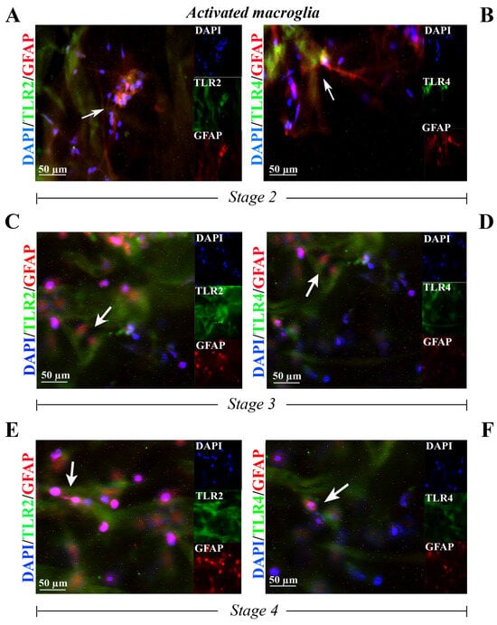Finally, a specific TLR2 (Figure 4A,C,E) and TLR4 (Figure 4B,D,F) expression was observed in GFAP-positive cells inside the whole flattened ERMs at stage 2 (Figure 4A,B), at stage 3 (Figure 4C,D) and at stage 4 (Figure 4E,F).