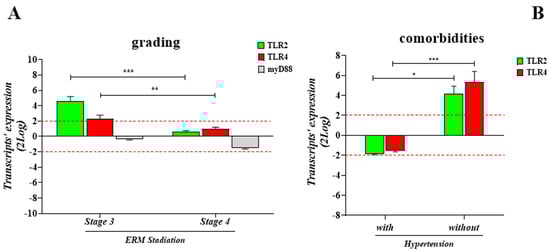 Transcripts’ expression as a function of disease severity and comorbidities. (A) Histogram showing the significant upregulation of TLR2mRNA in ERM at stage 3 with respect to stage 4, as well as compared to stage 2. The same trend was observed for TLR4mRNA. An inverted trend was observed for the adaptor molecule myD88mRNA, as downregulation was observed in ERM at stage 4 with respect to stage 3, and no significant changes were observed with respect to stage 2. Values are relative expression ratios (fold-changes in log2-scale; mean ± SEM), as generated by REST-analysis, comparing stage 3 or stage 4 with respect to stage 2. (B) Transcriptomic analysis highlighted a decreased TLR2 and TLR4 expression in the presence of the major comorbidities associated with hypertension (10/20; ID: 1, 2, 4, 8, 12, 13, 14, 15, 17, 19), while an increased expression was detected in the absence of hypertension (7/20; ID: 3, 5, 9, 10, 11, 16, 18). Values are relative expression ratios (fold-changes in log2-scale; mean ± SEM), as generated by REST-analysis, comparing clusters vs. normal controls (3/20; IDs: 3, 5, 10). The p-values were calculated according to the REST-ANOVA Tukey–Kramer coupled analysis. Red dot lines are referred to 2log-FC PCR biological significance. Significances are shown in the panels (* p ≤ 0.05; ** p ≤ 0.01; *** p ≤ 0.005), as calculated using one-way ANOVA followed by a Tukey–Kramer post hoc test (mean ± SEM).