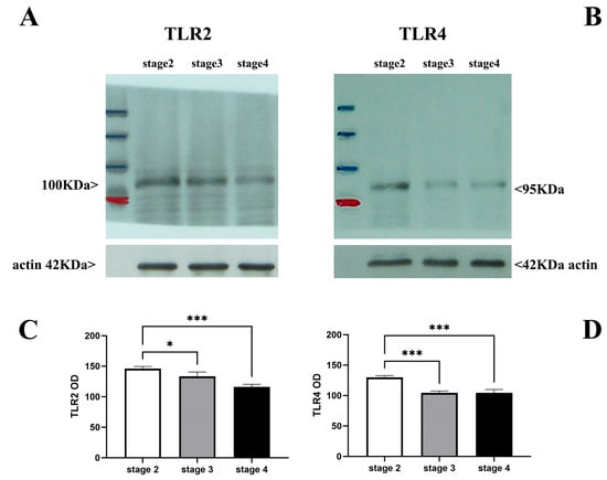 TLR2 and TLR4 levels in vitreous as a function of disease severity. A total of twelve specimens: N = 5 for stage 2 (ID: 2, 11, 13, 14, 19); N = 4 for stage 3 (ID: 8, 15, 16, 17); N = 3 for stage 4 (ID: 1, 4, 10) were processed for biochemical analysis. Briefly, the untouched vitreous samples were sonicated and cleared for Western blotting analysis. Representative vitreal levels of TLR2 and TLR4 (respectively, (A,B); IP/WB) are shown by gels, and densitometric IntDen analysis (C,D) was carried out considering all the samples. Note that TLR2 and TLR4 levels are comparable at early stages and greater than levels at late stages of the disease. Protein normalization was confirmed by actin expression. Data are mean ± SEM from optical density (OD) analysis (ImageJ) and p-values are shown by asterisks (see Section 4). Significant levels are shown in the panels (* p ≤ 0.05; *** p ≤ 0.005), as calculated using one-way ANOVA followed by a Tukey–Kramer post hoc test (mean ± SEM).
