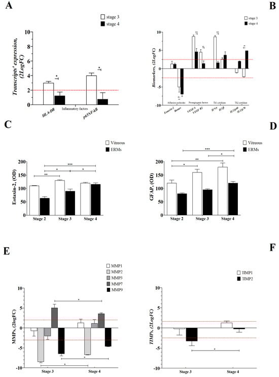 Inflammatory and remodeling profiles. (A,B) Inflammatory (A) and adhesion, proangiogenic and Th1/Th2 (B) patterns were analyzed, respectively, in ERMs and vitreous samples. (A) Note the HLA-DR and p65NFkB transcripts’ upregulation in ERMs at stage 3. (B) Adhesion molecules appear deregulated, VEGFA and VEGFR2 were upregulated at stage 3, and only IL1β and IL12p70 were increased at stage 4, all in vitreous samples. (C,D) Eotaxin-2 (C) and GFAP (D) expression in vitreal samples and coupled ERMs, as assayed by IP/WB analysis. Note that Eotaxin-2 and GFAP were increased in both membrane formation and coupled vitreous, in a manner related to disease severity. All diseases stages are shown. (E,F) Histogram depicting the relative transcript expression of MMPs (E) and TIMPs (F) in ERM extracts as function disease severity. Note the MMP2 and MMP9 transcript downregulation and the MMP7 transcript upregulation as early as stage 3. Whenever required, fold changes were calculated with respect to stage 2, and comparisons were carried out between stages. Data in the bar graph are shown as mean ± SEM (2log fold-changes) and p-values are shown by asterisks (see Section 4). Red dot lines are referred to 2log-FC PCR biological significance and significant levels are shown in the panels (* p ≤ 0.05; ** p ≤ 0.01; *** p ≤ 0.005), as calculated using one-way ANOVA followed by a Tukey–Kramer post hoc test (mean ± SEM).