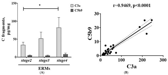 Complement fragments in vitreal fluids as function of ERM severity. Vitreal levels of C3a and C5b9 (ELISA; (A)); note that C3a levels were higher than C5b9 levels. (B) Scatterplot displaying the positive relationship between C3a and C5b9 markers. Pearson correlation coefficient (r) and significance are shown in the panel. Data are mean ± SEM, as detected by ELISA assay. Significant levels are shown in the panels (* p ≤ 0.05), as calculated using one-way ANOVA followed by a Tukey–Kramer post hoc test (mean ± SEM).